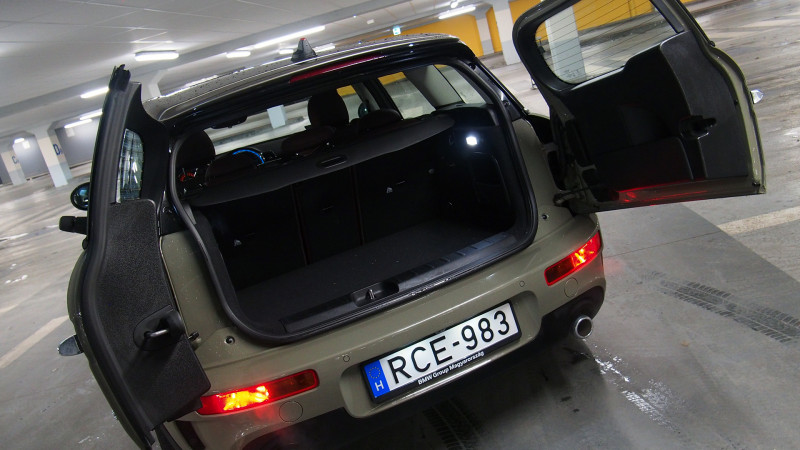 Az autó (egyik) különlegessége a csomagtérajtó, amely a Clubman szériához méltóan nem felfelé, hanem kettéosztva oldalra nyílik. A megoldásnak az egyediség mellett az előnye is megvan, hiszen jól használható, és a kisebb csomagok akár csak egy ajtó nyitásával is beszuszakolhatóak a poggyásztérbe.