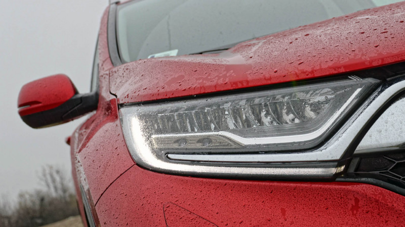 Mindenesetre tesztautónknak jól állt a japánok által prémiumként feltüntetett bordó fényezés – van egy átlagosabb piros is a kínálatban, aminek elég hasonló az árnyalata. Érdemes kiemelni, hogy a LED fényszórók bár nem a piac legjobbjai, de egy normál halogén megoldáson így is bőven túltesznek, és minden CR-V-hez alapáron járnak.