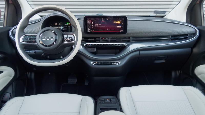 Szóval egy hangulatában egyértelműen az elődével rokon, mégis alapjaiban más autó lett az új 500. Egy önálló brand, ha úgy tetszik, hiszen az orrán nem a Fiat-jelvényt, hanem a típus nevét hordja. A logikus fedélzeti rendszer és az informatív – természetesen digitális – műszercsoport mellett prémiumos húzás a 10,25-ös központi kijelző szélesvásznú kialakítása. Vezeték nélküli telefontükrözést és hasonló töltést is ad az autó, a hangutasításokkal ezúttal nem kísérleteztünk.