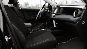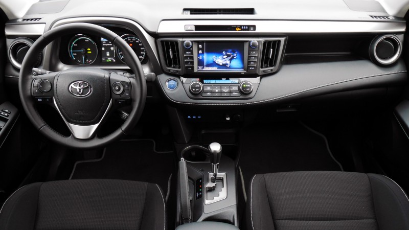 Az utastér ugyanígy a gyártó jellegzetes megoldásaira épül: a kissé eklektikus műszerfalról eltűnt a kvarcóra, van viszont egy szép felbontású, logikus menürendszer köré épített érintőképernyős multimédiás fedélzeti rendszer, amely nem csupán a zenét, navigációt menedzseli, de az autóval, illetve a hibrid hajtással kapcsolatos aktuális információt is képes megjeleníteni. Sok izgalmat nem rejt a RAV4 utastere, jóformán minden komor és fekete, amelyet a bőrkárpitozás opciójával színezhetünk, az ergonomikus kezelőszervek között pedig találunk pár régi ismerőst. Helyből viszont van elég, széltében is, illetve a hátsó utasoknak sem lehet panaszuk akár a lábtér, akár a fejtér tekintetében.