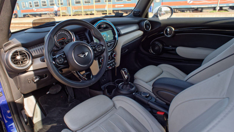 A megújulás belül is tetten érhető: új kormánykereket üdvözölhetünk, és alapból jár a 6,5 colos színes multimédiás rendszer. A feláras nagyobb egység esetén a kijelző érintőképernyőként is (jól) működik. A kínálatban megjelent a vezeték nélküli telefontöltő, és ha már digitális világ, a MINI Connected szolgáltatások szintén kibővültek. Sajnos nálunk a digitális lehetőségek csak korlátozottan elérhetőek, így például hiába rendelkezik a központi rendszer Apple CarPlay előkészítéssel, a telefonunk tükrözése még mindig nem elérhető (de hamarosan a tervek szerint már azzá válik). Ez pedig azért is fájó, mert az új központi nem képes nálunk a valós idejű közlekedési jelentések használatára, vagyis az egyébként egészen baráti 266 ezer forintos rendszernél szinte minden esetben jobban járnánk egy Google Maps-os vagy Waze-es útvonaltervezéssel.