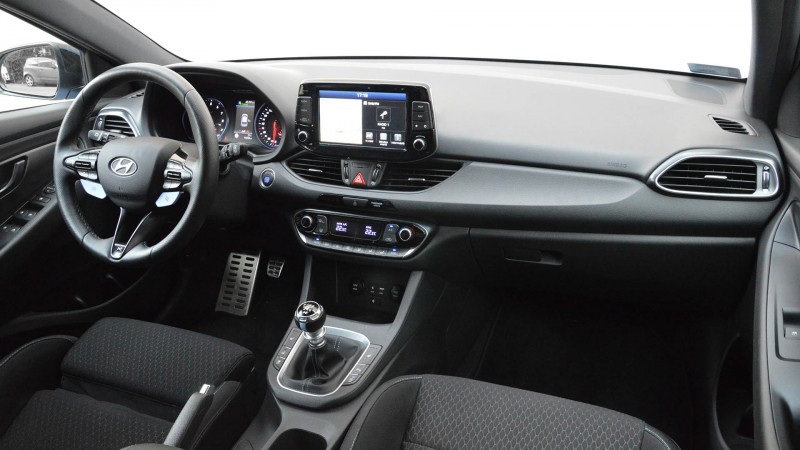 Ahogyan a helykínálat, úgy – a fent említett eltéréseket leszámítva – minden más is a normál i30-asból érkezik, így például az Android Auto és Apple CarPlay funkciókat is ismerő, okos és gyors multimédiás rendszer is. Utóbbi nagy újdonsága az N menüpont, ahol nyomon tudjuk követni a G-erőket, a köridőket, a gyorsulási időket, a pillanatnyi teljesítményt és nyomatékot, illetve a turbónyomást is, de itt szabhatjuk személyre az N Custom programot is, erről azonban később. Ami még említésre méltó, az a műszerfal tetején elhelyezett kis LED-csík, amelyik a váltásokra figyelmeztet minket, ráadásul üzemódtól függően: normál vagy éppen takarékos programban már jóval előbb felvillannak a kis színes fénydiódák.