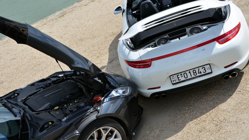Hova tegyük? Méltó ellenfél mellé - galériaMár a közvetlen összehasonlítás ténye is komoly kérdéseket vet fel a Porsche 911 és a Jaguar F-Type esetében. Ugyanis utóbbi ellenfele kialakítás alapján a Boxster lenne, ám mivel a brit roadster pozícionálásban magasabbra került, nem utolsó sorban az elérhető kompresszoros V8-as révén, nem vétség a farmotoros 2+2-es kabrió ellen harcba küldeni. A hazai piac viszonylag kis mérete, valamint ebből eredően a lehetőségek szűkössége miatt még egy sajátossággal kell megbarátkoznunk: az összehasonlítóra a 911 Cabriolet opciós összkerékhajtással érkezett, ám mivel már több ízben vezettünk hátsókerékhajtású kiadásokat, ezért az értékelésnél ezt vesszük alapul – a cikk végi táblázatunkba viszont a szélesebb hátsót kapó négykerékhajtású típus került.