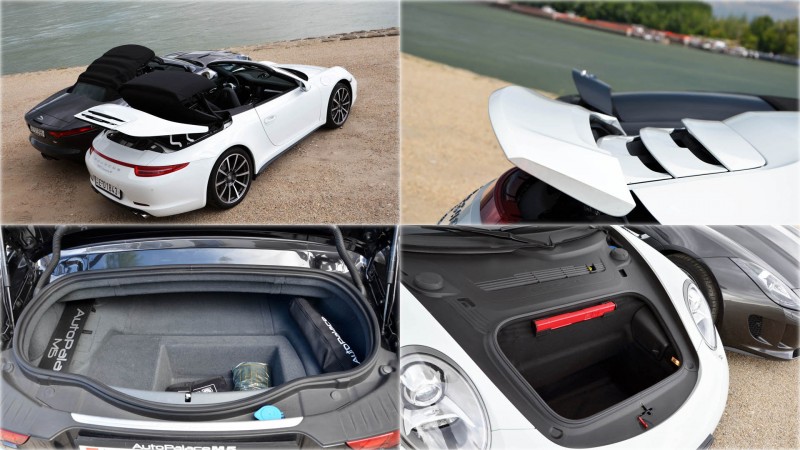 Ha már kabrió, s sportautók, a csomagtartó terén nem szabad csodákra számítani. A Jaguar kissé nehezen kihasználható 196 literes rekeszével szemben is alulmarad a Porsche 125 literes tartója. S ha már kabrió, a tető minősége és a karosszéria szélterelő képessége kiemelkedően fontos. Előbbiben a Porschénél van a pont: a magnéziummal erősített vászontető 50 km/h-ig nyitható-zárható, épp úgy, mint a Jaguar esetében, ahol ráadásul a folyamat méréseink szerint 5-6 másodperccel gyorsabban is megy végbe. Ám hangszigetelésben a plusz tömítőanyag miatt a 911 szinte kupés magasságokba emelkedik, miközben az F-Type-nál azért hallani, hogy fém helyett vászon húzódik a fejünk felett.