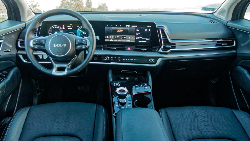 A kortársakhoz (persze már nem a 21. század szülöttéről, a stílusos férfi frizurák készítőjéről, hanem a Sportage konkurenseiről beszélünk) viszonyítva alacsonyan húzódik a Sportage műszerfala, így szokatlanul lefelé kell néznünk a vezetőülésből. Erre az atipikus elrendezésre a belsőépítészet vizuálisan is ráerősít: szinte térdmagasságban húzódik a máshol mellvonalban elhelyezett vízszintes – amúgy gusztusos – díszcsík.