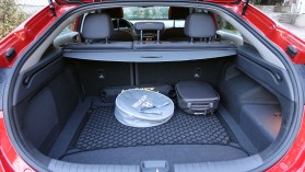 Nem csak a külső formavilágot, de az utastereket tekintve is ikertestvérnek tekinthető a két hibrid Ioniq, az egyedüli különbség a konnektorról is tölthető változat jóval kisebb csomagtartója, ami alaphelyzetben 550 helyett 446 literes a gyári adatok szerint, bővítve pedig 1505 helyett 1401 literes. A 446 liter nem hangzik rosszul, de nagyon kíváncsi lennék, hogy ez miként jött ki, ránézésre és használat közben ugyanis nem érezni 300-350 liternél öblösebbnek a ‘puttonyt’. A helykínálat tekintetében nem kell kompromisszumokat kötni, hiszen elöl-hátul tisztességes tér áll rendelkezésre – ezt a 4470 mm-es hossz mellett a 2700 mm-es tengelytávolság is szavatolja. Az erősen lejtő tetővonal miatt egyedül a hátsó fejtér korlátozott kissé. Belül a jellegzetes Hyundai elemek építik fel a műszerfalat, így maga az óracsoport, az érintőképernyős multimédiás rendszer és a kezelőszervek java már ismerős a többi modellből.