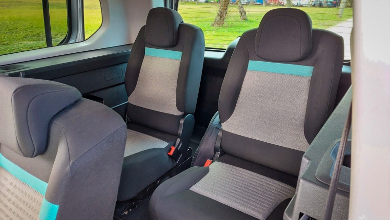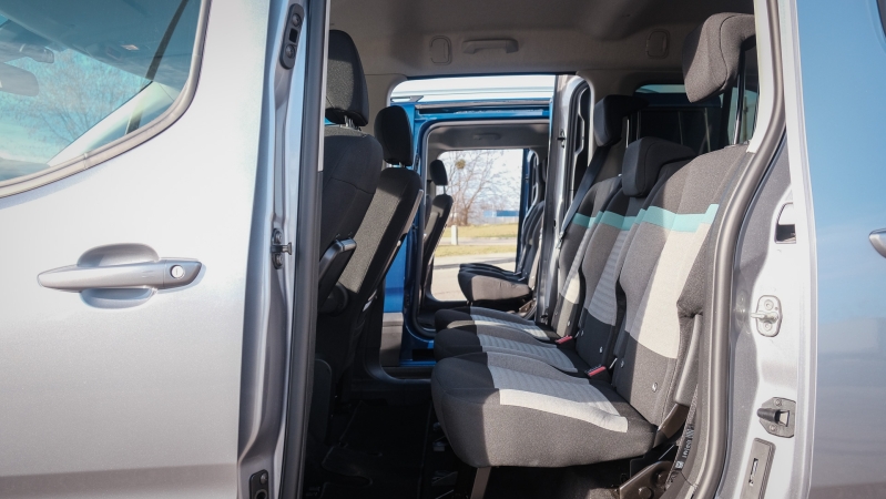 Hátra nagyon kényelmes a beszállás a mindkét oldalon teljesen elhúzható tolóajtónak köszönhetően. Megfelelő lábtér fogadja az utazókat a három egyformán formázott ülésben. Mindhárom ülésen van isofix rögzítési pont, így elméletileg három gyermekülés is elfér egymás mellett, a gyakorlatban ez a gyermekülés méretétől és a szülő tetris-ben szerzett jártasságától függ.