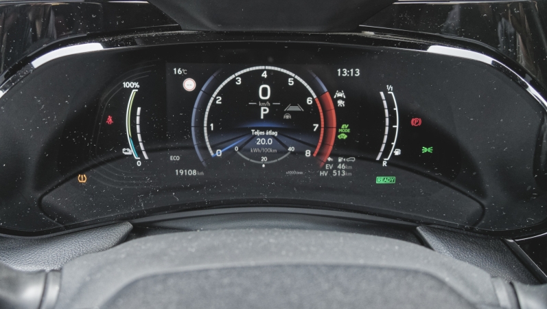 Városban, kicsi fűtéssel huszonegykét kilowattórás fogyasztást mutatott a változtatható grafikájú digitális műszeregység. Fontos, hogy a hőszivattyús fűtés miatt az autó benzin égetése nélkül is képes fűteni – így télen is van értelme villanyosként használni a Lexust. Országúton 5,5 liter 95-ös fogyott 100 kilométerre vetítve, az autópályás 130-hoz 8 literrel érdemes kalkulálni.