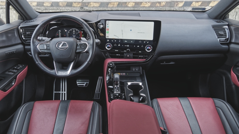 A Lexus két jelentős lépést is megtett az új NX-szel: egyrészt kiadták a márka első konnektoros hibridjét, másrészt pedig megszabadultak a régi, körülményesen kezelhető fedélzeti rendszertől. A Toyota RAV4-gyel összehasonlítva finomabb anyagokat, még nívósabb hangszigetelést, és (jelenleg) nagyobb tudású fedélzeti rendszert kap a vevő. A prémium konkurensekkel szemben pedig a jól bevált hajtáslánc lehet a meggyőző érv. A továbbra is lexusos formaterv mellett tehát sikerült magasabb szintre emelni az ergonómiát, a külső forrásból tölthetőség pedig régi tartozása volt a japánoknak. A 450h+ katalógusában a különböző töltők rögtön a színek után következnek, így láthatják az érdeklődők: 22 kW-tal is folyhat az áram az akkumulátor felé.
