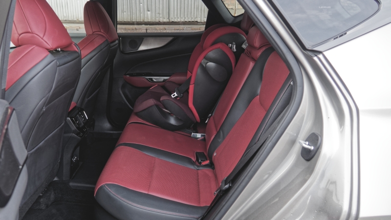 A sportülések szintén a F Sport csomag részeként kerültek az autóba. Viszonylag bátor színválasztását ízlés függvényében lehet megítélni, anyaga és illata mindenképp kellemes. Kihúzható combtámasz helyett alapból hosszú ülőlapot, kabát nélkül pedig még 25-ös érték fölé kúszó BMI-vel is kényelmes pozíciót biztosít – a viszonylag passzentos kialakításából adódó határozott oldaltartás mellett.