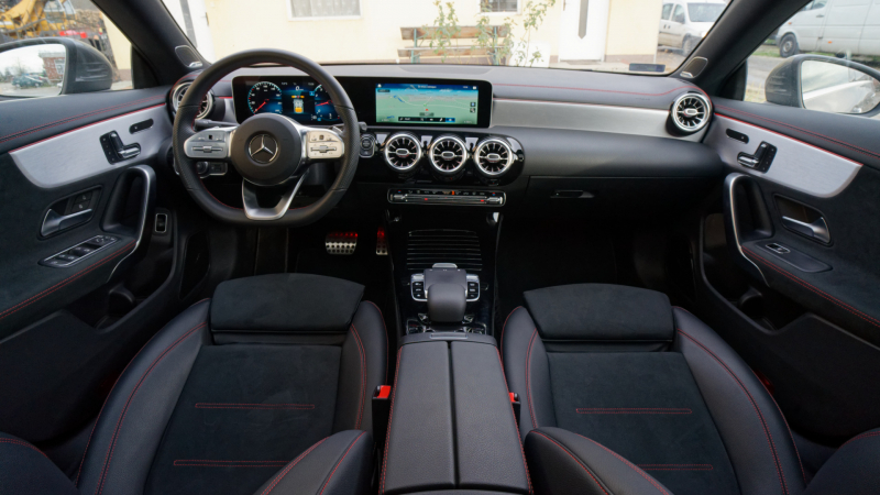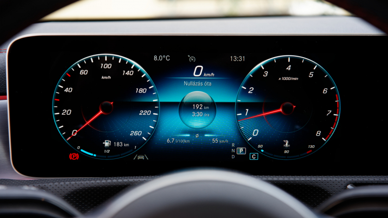 Bár az A-osztály tesztből már ismerős, érdemes rátérni a belső térre, amelynek két 7 colos széria kijelzője bőséges felárakkal két, gyönyörűen élet és kontrasztos képet adó 10,25 colosra kerülhető. Ez az MBUX névre hallgató központi rendszer minden eddiginél fejlettebb és több funkciót állít rendelkezésünkre amellett, hogy teljes személyre szabhatóságot biztosít. A dicséretet pedig már csak utóbbi miatt is megérdemli, hiszen így végre nem csak az analóg megoldás digitális leképezése a műszercsoport, hanem egy egyénre igazítható tökéletes információforrás. Ráadásul a navigációs rendszer kibővített valóság funkciója olyat tud, amitől utasainknak leesik az álla: opcionálisan az első kamera képét beadva valós időben, animált nyilakkal navigál minket úti célunk felé. Ez az egész persze öncélú felvágás, hiszen mi menet közben nem igazán tudjuk a központi kijelző kis nyilait vizslatni, vagyis a vezetőnek nincs nagy segítségére a rendszer, de jól mutatja, hogy mire lesz képes a technológia egy teljes szélvédőre vetítő kijelzővel együtt a jövőben.