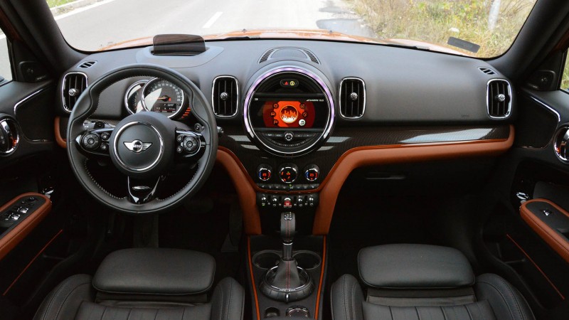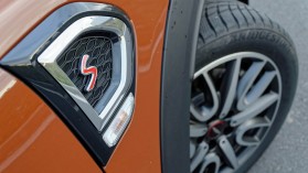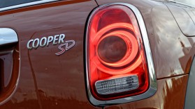 A sportosságra kihegyezett JCW verzió után az SD egy jóval elegánsabb összeállításban érkezett meg hozzánk, és bár ennél a változatnál is bőven találkozhatunk dinamikát sugalló elemekkel – mint például a nagyobb légbeömlők, a hangsúlyos kipufogók vagy éppen az S jelölések –, az érdekes barnás-narancssárgás fényezés, a fekete tető és a krómdíszítések sokkal inkább az elegancia irányába viszik el az amúgy izmos modellt.