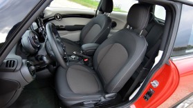 Kicsik, de a kormánnyal együtt mozognak a műszerekAz utastérre visszatérve, azonnal szembeötlő, hogy mennyivel jobb lett az anyagminőség; miközben a korábbi szériákat sokat kritizáltuk a kemény, gyakran sorjás plasztikok miatt, az új generáció műanyagjai még a kisebb BMW-sorozatokét is verik, a kidolgozás pedig szintén tisztességes. Végre igazi prémiumtermékkel van dolgunk, igaz, a rossz úton itt-ott zörgésre hajlamos belső csökkenti valamelyest a minőségi összhatást. A formák terén nem engedhették meg a gyáriak a túlzott forradalmat, így márkajelzés nélkül is azonnal megállapíthatjuk, hogy miben ülünk: a kormány, a kerek motívumok, a klasszikus formák és a billenőkapcsolók mind-mind az előző szériákat idézik. A legnagyobb különbség, hogy a tervezők a MINI védjegyéül szolgáló óriási középső sebességmérőt átköltöztették jóval kisebb méretben a műszerfalra, a fordulatszámmérő mellé, ami szerintük jobb leolvashatóságot, így nagyobb menetbiztonságot szavatol, azonban túl kicsire és sűrűre sikeredett a műszercsoport, amit ráadásul könnyen kitakarhat a kormány; azért a mérnökök igyekezetét jelzi, hogy az órák együtt mozognak a kormányoszloppal, ha állítjuk a volánt.