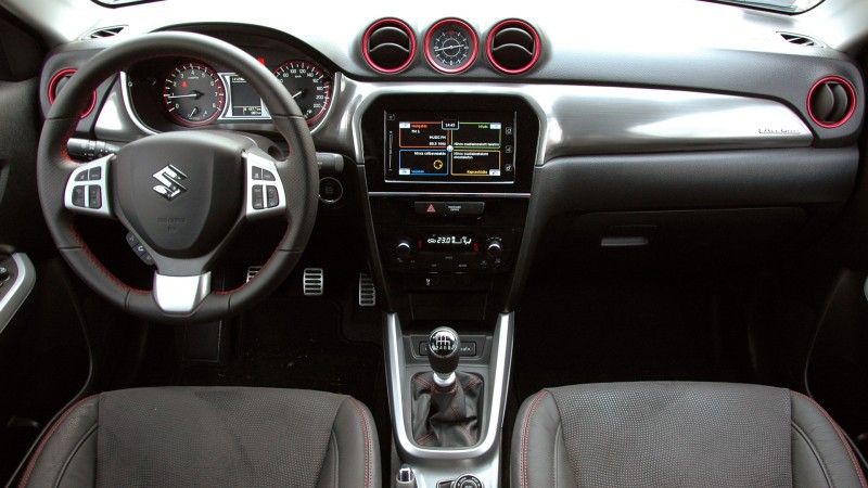 Tágas és kényelmes a Vitara - galériaA fényszórókban megjelenő bíbor árnyalat feltűnik idebenn is, a légbeömlők gyűrűi, illetve az óracsoport skáláinak karimái ugyancsak ezt a színt viselik, továbbá az utas oldalra került betét sokat dob az egyébként unalmas, szürke pulton.
