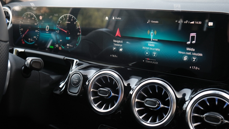 Persze nagy meglepetés belül nem fogad minket, hiszen a kompakt paletta már bemutatkozott tagjainak megoldásaival találkozhatunk, kezdve a kerek légbefúvóktól a műszeregység és a multimédiás rendszer párosát felvonultató hatalmas kijelzőkön (alapáron 7 colosak, de felárért mindkettő lehet 10,25 colos is) át egészen a kezelőszervekig. Minden minőséget sugárzóan működik, a kijelzők valóban tűélesek, ízléses grafikákkal és kellő fényerővel. Persze csodát tenni nem lehet, a hatalmas, fényes felület olykor-olykor becsillan.