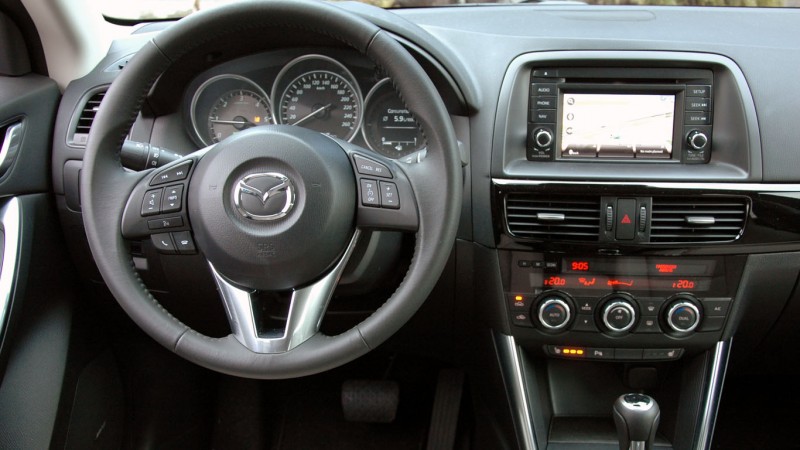 A Mazda belül ugyancsak fiatalosabb formákat vonultat fel, amelyeket divatos zongoralakk betét és sportos műszercsoport egészít ki, s az érintőképernyős információs- és szórakoztató rendszer ezúttal is részét képezte a felszereltségnek. Utóbbival viszont nem voltunk maradéktalanul megelégedve, noha nem is a gyorsaságával, mint inkább a kijelző szépségével akadtak gondok, valamint az mp3 számok belistázása kicsit akadósan történik. A pixelesség ugyanúgy jellemző rá, mint a műszercsoport jobb szélső körébe applikált fedélzeti számítógép kijelzőjére, s a grafikák sem a legszebbek. Dicséretes viszont a logika és az ergonómia, valamint végre valahára egy jól szóló Bose hifivel is sikerült megspékelni az autót.