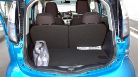 A csomagtartó nem nagy, de ügyesen bővíthetőedül a kissé szűk, ám rövid távokra bőven tolerálható válltér jelent kompromisszumot. A csomagtartó nem nagy, alapállapotában 166 literes, de a hátsó üléstámlák külön-külön teljesen síkba hajthatóak (emellett dőlésszögük is változtatható) és így már 860 liternyi puttonnyal számolhatunk. Az átgondolt, okosan berendezett beltérben mindössze egy dolog zavaró: az állíthatatlan kormányoszlop mellett az elsötétíthetetlen belső tükör illetve a kemény, rossz úton össze-összezizzenő műanyagtenger, ami egyértelműen jelzi a kontrasztot a modell jelen kivitelének ára és a sima benzines Mitsubishi „i” egyszerű városi autó (úgynevezett „kei car”) mivolta között.