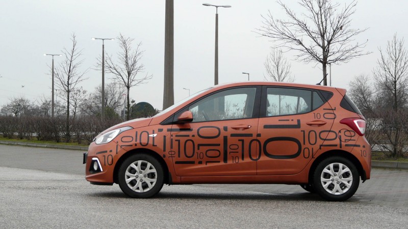 Esetünkben, a narancssárga színben pástra lépett versenyző azzal a kihívással is találkozott, hogy tesztelője először ült a dél-koreai gyártó egyik autójába, amiről eddig csak szubjektív külső tapasztalatai voltak. Felár ellenében, de megnyerően kacsintKarakteres formavilág, kiugró szögek, hatszögletű hűtőrács és masszív útfekvés jellemzi az autót, játékos elemekkel, szép kerekekkel tarkítva. Már az első pillanatban is rokonszenves volt, de akárhányszor találkoztam a parkolóban az i10-zel, mindig mosolyra csábított. A tesztautó matricái némileg zavaróan hatottak, de a katalógus szerinti színválaszték minden vásárló számára élvezetes választékot nyújt majd. Az opcionális (ködlámpával 60 e Ft) LED-es nappali menetfény csak emeli az összképet, a karosszériába simuló lámpatestek szépen íveltek elől és hátul egyaránt, a csomagtartó féklámpája a tükrökbe épített jelzés mellett csak fokozza a sportos külsőt és a biztonságos megvilágítást.