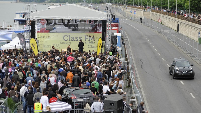 Ráadásul nem is vezetett rögös út odáig. Az Opel Corsa OPC nürburgringre felkészített verziójának tesztelése okán egyébként is izgalmasnak ígérkező délutánomat 11 órakor írta át Palkovics Péter, a Nissan PR és marketing menedzserének telefonja. A hívásból meghívás lett, így oldalamban némi kíváncsisággal már idő előtt megjelentem a Pesti alsó rakpart Szent István park felöli részén, ahol a Juke-R Street Driving Show pavilonjai már javában álltak és az alapos átalakításokon átesett törpeszörny az első köreit rótta.