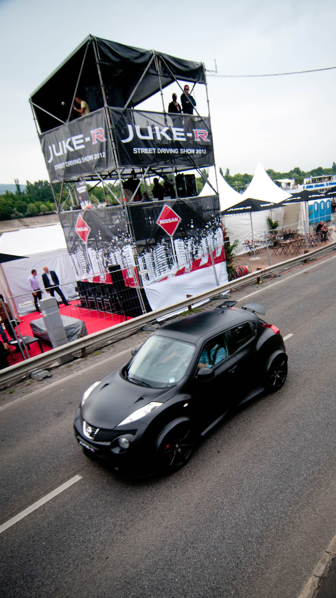 Alig két másodperc alatt felgyorsultak az események: már húztam is a kormányon elhelyezett, masszív, súlyos váltófület, néhány pillanattal később pedig már a 2. fokozatnak is búcsút intettünk. Már épp a 3. forgott le és hirtelen kezdett keskenyé válni a rakpart két sávja, így feljebb kapcsolva gondoltam kicsit vizsgálódom a motor rugalmassága és az autó stabilitása iránt – hűen tükrözve az Autó Pult szellemiségét. Mintha megsértettem volna, „felügyelőm” rögtön kiáltott: „nyomjad, nyomjad!”. Na persze, végtére is show van a nevében, a nézelődők pedig száguldó méregzsákért jöttek: akkor száguldjunk. Száguldottunk: a rakpart végén már 200-as tempó környékéről vettünk féktávot, a szlalomot pedig rettentően gyorsan abszolváltuk. Itt egyúttal az is kiderült, hogy a GT-R összkerékhajtása, vele együtt pedig az autó fara nagyon szívélyesen táncba vihető, amely tulajdonságát a továbbra is meghagyott menetstabilizáló rendszer nem hagyta kiteljesülni. Miközben úgy 170 km/h-val haladtunk át a célvonalon, ahol fényképesek és nézők követett fejével, még épp annyi időm maradt, hogy arra gondoljak, mennyivel nagyobb móka lehet mindez az alacsonyabb súlypontú GT-R-ben, már fordultam is be az alkalmi boxutcába és búcsúztam a Juke-R-től.