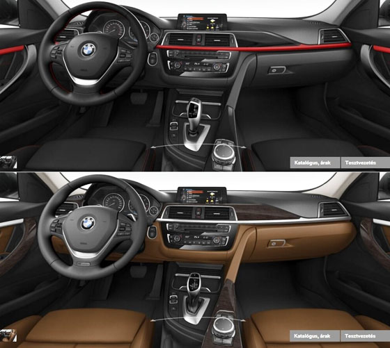 Ezt hívják szép megjelnítésnek - szuper a navi (is)Fapadosságról szó nincs: minden fontos extrát megkapott a próbára tett 318d, amit 14 millió forintos listaára kiválóan mutat, azonban a komor hangulat révén jóval olcsóbb autóban éreztük magunkat. Tudjuk, az ízlésről nem lehet, pontosabban nem érdemes vitát nyitni, de higgyék el, megéri játszogatni a színekkel és a gyár által felkínált lehetőségekkel, amikor összeállítanak egy autóbelsőt. Merthogy alig néhány százezer forintnyi plusz ráfordítással – ami 14 millió forintnál már minden bizonnyal nem oszt vagy szoroz – olyan belsőt állíthatunk össze, ami valóban luxushatást kelt. És itt nem feltétlenül a kétszínű bőrrel bevarrt műszerfalra, vagy a nappa bőrborítású, kontrasztvarrással ellátott Individual üléskárpitokra gondolok, amelyek lenyűgözően szépek, de nem meglepő módon méregdrágák. Hanem például nézzék csak a következő képeket; Önök melyikben ülnének szívesebben? - a fenti képen a tesztautó konfigurációja látható, az alsó kép pedig egy vidámabb és jóval melegebb hangulatú, de mégis egészen praktikus színösszeállítású belsőt illusztrál.
