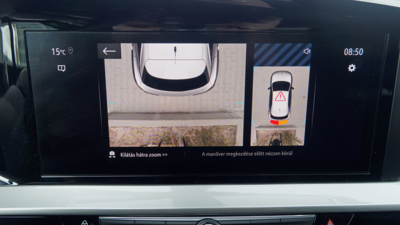 Jó hír, hogy egészen használhatóra sikerült a 10 hüvelykes kijelzőn kommunikáló fedélzeti rendszer. Beszédes, hogy az átvételkor szláv nyelven beszélő autómból egy sarok alatt faragtam magyarul kommunikáló járművet. Vezetékes CarPlay, több dimenzió mentén testre szabható, esetünkben 12 colos műszeregység, normális működési sebesség és grafika jut a mokkások osztályrészéül. A Pure Panel, vagyis a közös házba terelt két kijelző pedig teljes újdonság az Opelnél.