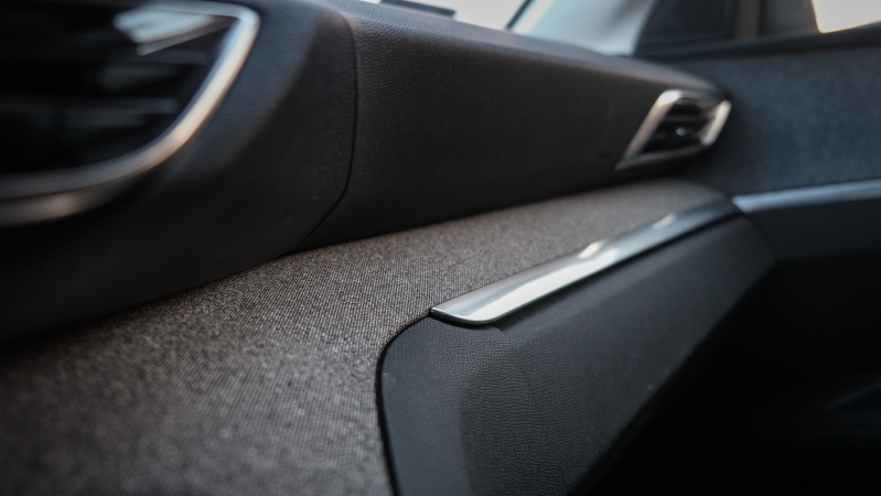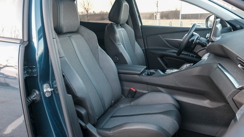 A modern megoldások mellé letisztult formák és meglepően jó anyagminőség párosul. Nagyméretű szövetburkolatokkal, amolyan egyedi módon kényeztet minket a Peugeot, miközben a fémhatású műanyag betétek igazán jól összekötik az egyébként puha műszerfalborítást a szövet elemekkel. Az összhatás így elegáns, letisztult és minőségi, ráadásul ezt mindenféle fa és karbon használata nélkül érték el a franciák.