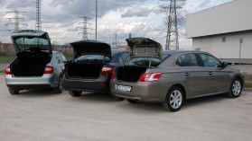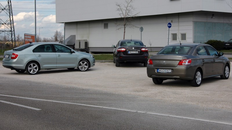 A csomagtartók űrtartalmát tekintve a két francia 500 liternél mozog, ám a Peugeot a belógó, burkolatlan zsanér és annak élesen vágott vége miatt szemöldökráncolást vált ki, a győztes pedig egyértelműen a hátsó ablakkal együtt nyíló csomagtérajtóval és 550 literes kapacitással büszkélkedő Rapid. Bővíteni mindegyik puttonyt lehetőség van, ám a két négyajtós itt némi hátrányt szenved, hiszen az ülések ledöntésével is csupán szűkebb nyílás keletkezik az utas- és csomagtér között.