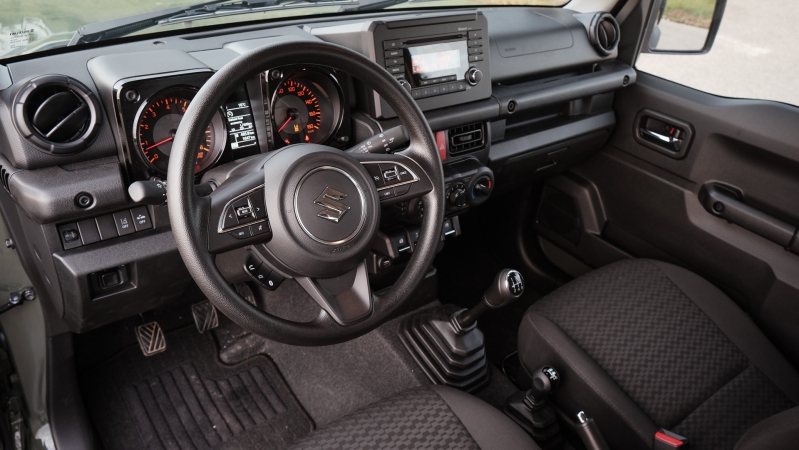 Mindemellett a többi Suzukiból ismerős kezelőszervekkel és egységekkel találkozunk. A kormány például a Swiftben is szolgálatot teljesít, azonban a korábban elérhető érintőképernyős központi rendszerről le kell mondanunk, helyét egy egyszerű, kétsoros "rádió" vette át, ami legalább kékfogas okostelefon kapcsolatra képes, de mindössze ennyi, ezen felül legfeljebb a fejegység menüjének lassúsága kelti fel az ember figyelmét. Az extralista a Jimny küldetéséhez mérten teljesen rendben van, manuális klíma, ülésfűtés, sávtartó asszisztens és ráfutásgátló is rendelkezésre áll.