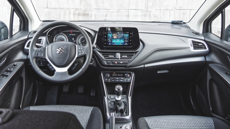 Ezúttal a szépen felszerelt GLX kivitelt vihettük el hatfokozatú manuális váltóval. Bár a tél már bőven mögöttünk van (és hol van még a következő hideg évszak, a tesztet éppen 32 fokban írom), a biztonság kedvéért AllGrip összkerékhajtást is kapott az S-Cross. Kipróbált részegység mindegyik, a Suzukinál továbbra is azt kapjuk, amit látunk, és amire számítunk. Kényeztető belső helyett korrekt – bár néhol olcsónak tűnő – és strapabíró utasteret; sportos, de rázós felfüggesztés helyett kiszámíthatóan viselkedő futóművet; sok henger és három turbó nélkül is épp eléggé nyomatékos motort. Bár a sok hengeres rész relatív, manapság az S-Cross négy cilinderének is örülni kell. Talán az egyetlen marketinges túlzás Hybridnek nevezni az enyhe hibrid megoldást. Azért is indokolatlan a nagyzolás, mert egy ideje teljes értékű hibridet is árul a Suzuki.