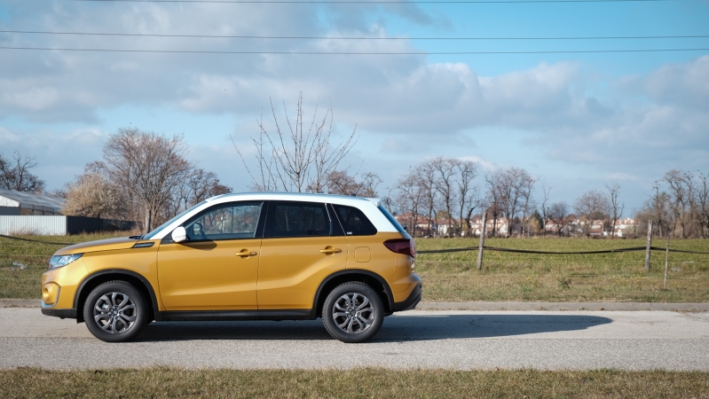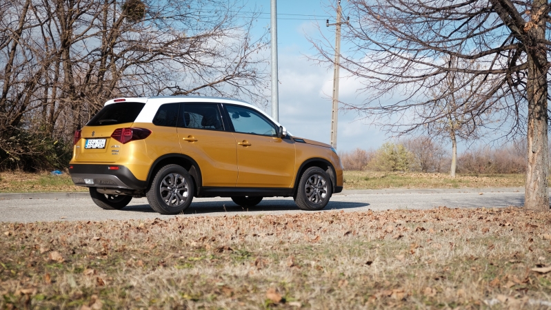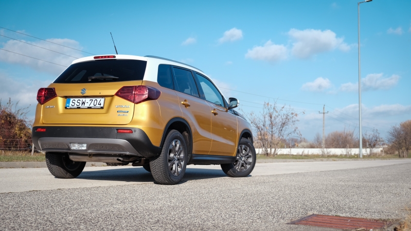 A lendület kicsit elfogyott, amikor a tervezők az autó hátuljáig elértek, épp ezért a far már kissé fantáziátlanra jött össze. Szigorú tekintet, klasszikus osztású karosszéria és a két árnyalatból összetevődő színkombinációknak köszönhetően még feltűnőbb megjelenés – ezt tudja a Vitara. Illetve nem mehetünk el szó nélkül amellett sem, hogy a hasmagasság és az első-hátsó terepszögek már látványra is sejtetik, hogy bizonyos mértékig tényleg képes terepezni az autó, azonban a sérülékeny műanyag elemek miatt vad erdőjárásra már nem merészkednénk vele.
