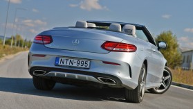 Természetesen a futóműre és a kormányzásra is ki kell térnünk, már csak azért is, mert tesztautónkban a németek légrugós AIRMATIC rendszere szerepelt. A feláras megoldás pedig szinte tökéletesen tette a dolgát, ügyesen lépte át az úthibákat, és a tempósabb kanyarokban is jól tartott –ráadásul gombnyomásra néhány centivel meg tudja emelni az autót, hogy ne kerüljünk szorult helyzetekbe. Apropó, ha már a gyors fordulóknál tartunk: a C-osztály Cabrióval sokkal nagyobb élmény a vonulás, mint a száguldás, persze akkor sem hagy cserben, ha sietnénk. Sőt, Sport Plus módban kicsit meghajtva még egy kis mókázásra is rá lehet venni, de a közel 1,7 tonnás önsúllyal nem annyira kívánjuk ezt. A kormányzás pedig mindenhez jó társ: közvetlen, jól súlyozott és kellő visszajelzéssel szolgál.