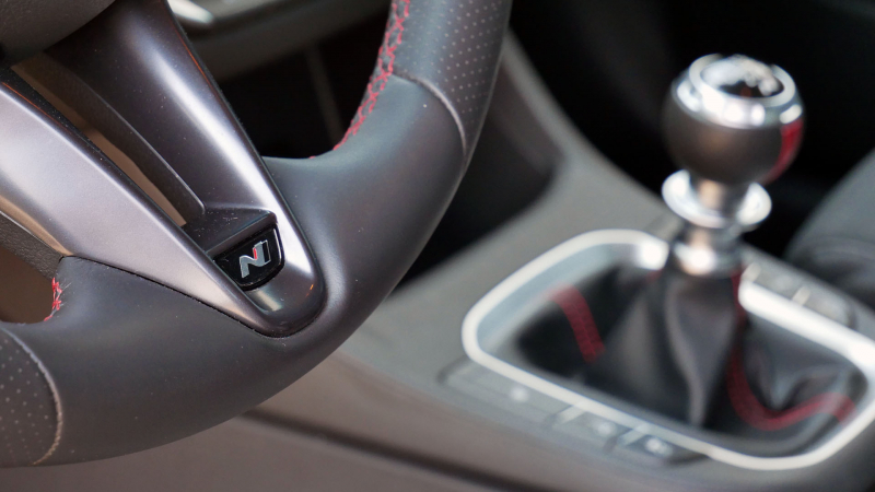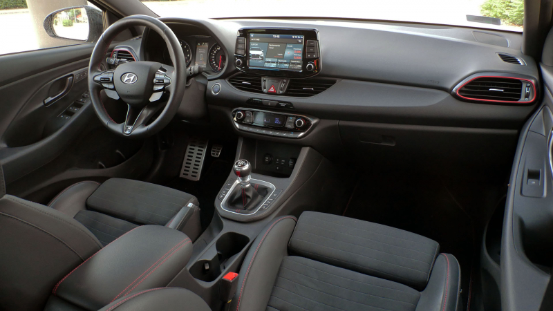 Az utastérbe ülve azonban tény, hogy még kevesebb jel utal arra, nem egy átlagos i30-cal van dolgunk. Az árulkodó részletek közül a legszembetűnőbb mindenképpen a sportülés és a sportkormány, melynek zászlós gombja csak úgy világít az egyébként kissé komor, fekete utastérben. Néhány díszesebb betét, kicsit több piros részlet azért elfért volna még, annak dacára, hogy azért több helyen – a váltón, az ülés háttámláján, a műszerfalon, a kormányon és a küszöbön is – megjelenik az N betű. A műszerfal középső dekorja vagy éppen az amúgy dicséretes kézifékkar például kemény műanyagból készült, ahelyett, hogy valamilyen puhább matériát alkalmaztak volna. Ettől függetlenül az általános minőségérzettel egyáltalán nincs gond, ahogy az összeszerelés is példás.