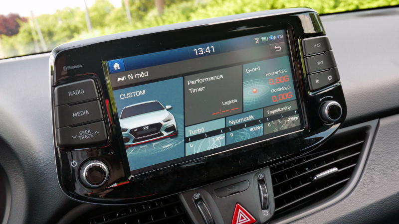 Ahogyan a helykínálat, úgy – a fent említett eltéréseket leszámítva – minden más is a normál i30-asból érkezik, így például az Android Auto és Apple CarPlay funkciókat is ismerő, okos és gyors multimédiás rendszer is. Utóbbi nagy újdonsága az N menüpont, ahol nyomon tudjuk követni a G-erőket, a köridőket, a gyorsulási időket, a pillanatnyi teljesítményt és nyomatékot, illetve a turbónyomást is, de itt szabhatjuk személyre az N Custom programot is.