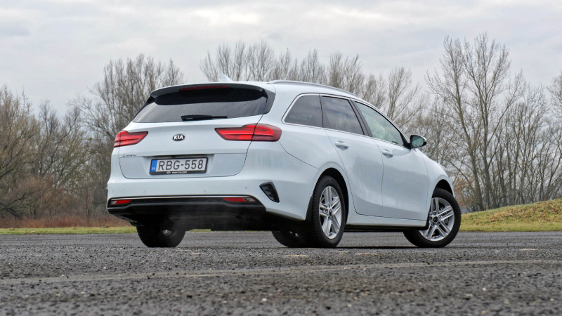 A hátsó traktus saját formákat kapott: persze a rokonság tagadhatatlan, de a tervezők új fényszórókat rajzoltak a puttonyosnak. Mivel ott van a kínálatban a Proceed is – amelyről egyébként szintén hamarosan érkezik majd a tesztünk –, így a gyáriak az SW esetében nem törekedtek annyira a vagány, dinamikus formákra, aminek a végeredménye egy klasszikus kombi lett, de ez is jól áll az autónak.