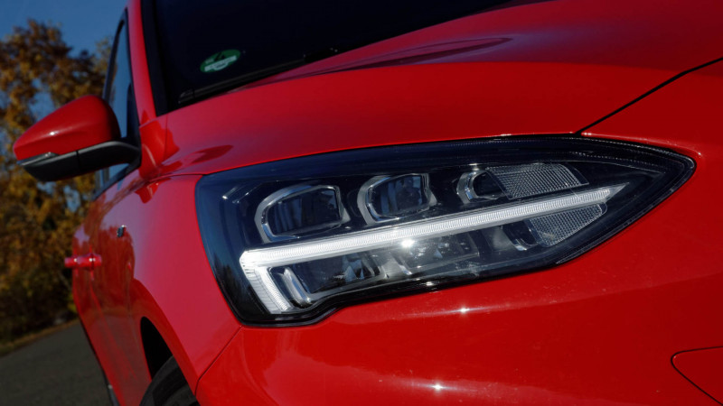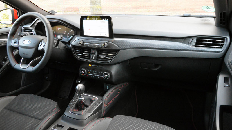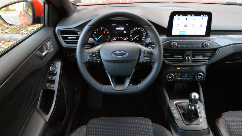 Az ST-Line csomag nem csak kívülről, de belülről is feldobja a Focust, ami a sportos részletekben, a karbonszerű betétekben és a piros kontrasztvarrásban nyilvánul meg, és bár az alapszín fekete, előbbieknek köszönhetően a hangulat egyáltalán nem komor. A modern részletekből talán a kissé ódivatú műszerfal lóg ki: a középső színes kijelző ugyan szép, de mások már kínálnak teljesen digitális, vagy legalábbis jóval látványosabb megoldásokat is. A multimédiás rendszer azonban továbbra is dicséretes: a magyar nyelv hiányát leszámítva minden fronton kiválóan teljesít, és az Android Auto illetve Apple CarPlay rendszereket is ismeri – igaz, csak felárért. Egyedül a középkonzol tetejére került érintőképernyő áll kissé furcsa szögben (túlságosan függőleges és nincs a sofőr felé fordítva), de némi megszokás után ez sem okoz zavart.