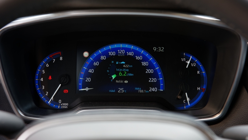 Az erőforrás pedig rögtön két dologban is nagyon hálás volt. Egyrészt sokkal jobban mozgatta a Corollát, mint ahogyan azt a gyári adatok ígérték. A 0-100-as gyorsulás például 12,1 másodperc helyett 9,7 alatt megvolt, ami hatalmas különbség. Persze a 125 lóerő indokolja is a 10 másodperc körüli gyorsulást, vagyis a gyári adat túl pesszimista, ami valahol érthető: a gyártó úgy szeretné pozícionálni, hogy a hibrid a dinamikusabb alternatíva, pedig valójában pont fordított a helyzet. Mérve a hibrid 11,9 alatt van százon, a szívómotor verzió pedig 9,7 másodperc alatt, ami nagyon más, mint a gyári adatok 11 és 12,1 szekundumos ígérete.