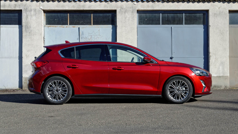 A letisztult orr a kompaktokhoz viszonyítva egészen hosszúnak tűnik profilból, az oldalsó ablakkereket C-oszlopi végződései pedig még inkább rájátszanak arra az érzésre, hogy az utasfülke hátra van tolva. Az oldalsó árnyéktörő vonalaknak köszönhetően izmosnak tűnő hátsó kerékjárati ívekre az autót széltében széthúzó fényszórók is rájátszanak, így – főleg hátulról – széles, már-már sportos kiállással rendelkezik a Focus. A méreteket tekintve nem sokat változott elődjéhez képest az autó: az ötajtós mindössze 1,8 centivel lett hosszabb (4378 mm), ám 3 centivel alacsonyabb (1454 mm), ami szintén erősíti a dinamikusabb megjelenést.