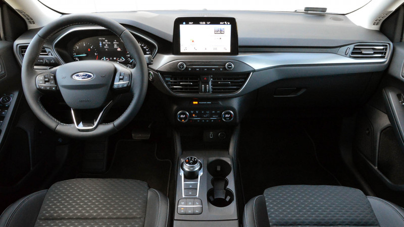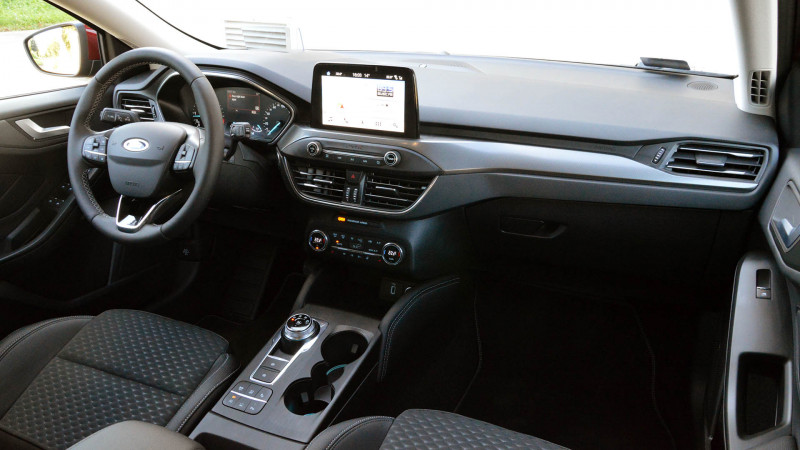 Ha már úgyis úton vagyunk, ideje rátérni a hajtásláncra is. A Ford 1,5 literes EcoBlue dízelének 120 lóerős verziója dolgozott a tesztautóban, méghozzá elég jól hallhatóan. Hideg indításkor, de még bemelegedve, gyorsításkor is elég hangosan kér szót magának az egység, ellenben fix fordulaton olyannyira elhalkul, hogy akár még bőven autópályás tempó felett is suttogva társaloghatunk utasainkkal. A 120 lóerő és a 300 Nm-es csúcsnyomaték nem tépi szét a kasztnit, de a már 1750 1/perces fordulatnál ébredő nyomaték azért tesz róla, hogy egészen dinamikusnak érezzük a Focust, főleg alacsonyabb sebességnél – 100 felett, vagy konstans gyorsításkor azért már érezzük, hogy a lovak egy kissé szétszaladnak.