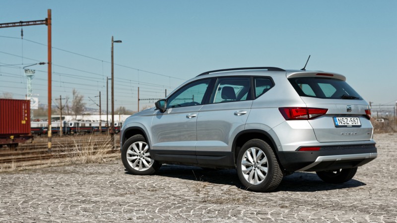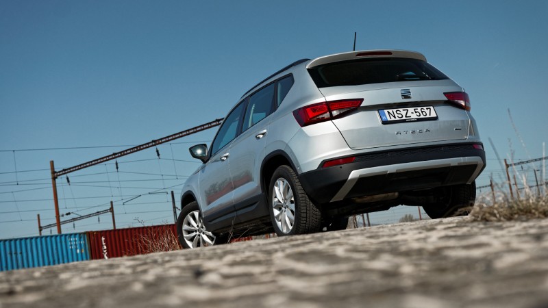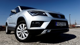 A dinamikus dízelmotorhoz egyébként a futómű kimondottan jó partner. A Tiguan hangolásánál egy árnyalattal feszesebbre vették a futóművet az Ateca estében, amelyet a pontos kormányzással ki is tudunk használni kanyarokban. Csodára persze nem érdemes számítani, de a teljesen semlegesnél egy fokkal jobban fogjuk érezni magunkat szerpentinen száguldozva. Emellett a modell hangolása kiszámítható, biztonságos, a rugózás hajszálnyi feszessége pedig egyáltalán nem zavaró, inkább csak egy kis karakterrel ruházza fel a modellt.