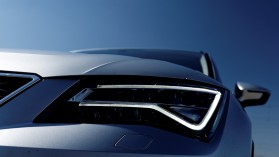 Ezen a szinten széria LED-es fényszóróvalAz Ateca élesre húzott vonalai közvetítenek egy kis spanyol virtust, de így sem találunk rajta igazán megosztó részletet. Ez a túlzott visszafogottság és óvatosság szerintünk nem feltétlenül előnyös egy önmagát sportosként pozícionáló márka esetében – mindenesetre mi megengednénk egy kicsit nagyobb távolságtartást is a Volkswagen Tiguantól és a hamarosan érkező Škoda testvértől. Az izgalmas részletek között kívül találunk méhsejtrács-szerű mintázatot elöl, amelyhez a nappali menetfények határozott vonása társít szimpatikus megjelenést. A formatervezők célja egyértelmű volt: a lehető legszélesebb réteg számára emészthető eredményt létrehozni.