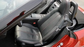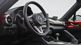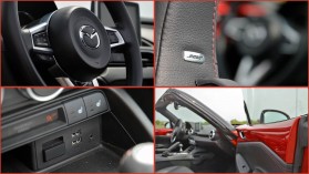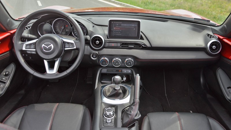 Az MX-5 utastere egyébként egyértelműen a vezetést helyezi előtérbe: a középkonzol tetejére biggyesztett kijelzőn kívül alig-alig találkozhatunk egyéb kezelőszervekkel – klímából is csak manuális, tekerőgombos változat létezik, de nincs is szükség másra. A műszerfalon a középre került fordulatszámmérőt jobb oldalról egy sebességmérő, míg baloldalról a központi rendszer informatív kijelzője fogja körül. Mi egyébként nem bántuk volna, ha a fordulatszámmérő sarkában lévő kis digitális megjelenítő a váltó aktuális fokozata helyett a sebességünket mutatta volna, ugyanis a viszonylag kis jobb oldali óráról nem mindig egyszerű rögtön leolvasni az értékeket – persze ez legyen a legnagyobb problémánk az MX-5-ben. Az anyagminőség érzésre kellemes, de azért sok helyen találkozhatunk keményebb műanyagokkal – ellenben egy nyikkanást sem hallhatunk sehonnan, amit a rendkívül merev karosszériának köszönhetünk.