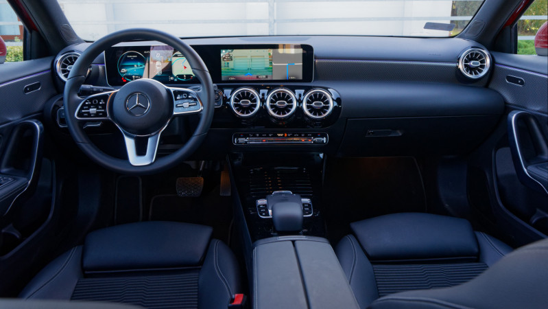 Az új A-osztály minden további tekintetben remekül sikerült. A letisztult, egyedi formájú, szépen kidolgozott 4,4 m hosszú karosszéria végre kimondottan tágas utasteret rejt: az elődmodell hátsó sora 180 cm-es testmagasság felett kimondottan szűknek érződött, nem úgy az aktuális széria beltere, tehát a helykínálat végre elöl-hátul tisztességes, mégpedig minden irányban. A magasabb felszereltségi szintekhez járó, rengeteg irányba állítható, kihúzható combtámaszos komfortülések nagyon kényelmesek, az összes kartámasz elhelyezése tökéletes, az ergonómia pedig szintén jó. A fekete A180d feláras ‘egybefejtámlás’ sportülései látványosak és kényelmesek, de 185 cm felett fejtámlájuk nem nyúlik elég magasra, így a magas vevők jobban járnak a komfortülésekkel. A minőség jó, a formák egyediek, az egész beltér kívánatos, a hangszigetelés jó, a feláras 64-színű hangulatvilágítás pedig sötétben egyedülálló, valóban prémium miliőt teremt.