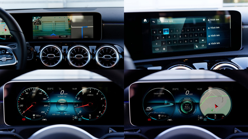 Búcsúzóul még érdemes visszatérni a belső térre, amelynek két 7 colos széria kijelzője bőséges felárakkal két, gyönyörűen élet és kontrasztos képet adó 10,25 colosra kerülhető. Ez az MBUX rendszer, amely minden eddiginél fejlettebb és több funkciót állít rendelkezésünkre amellett, hogy teljes személyre szabhatóságot biztosít. A dicséretet pedig már csak utóbbi miatt is megérdemli, hiszen így végre nem csak az analóg megoldás digitális leképezése a műszercsoport, hanem egy egyénre igazítható tökéletes információforrás. Ráadásul a navigációs rendszer kibővített valóság funkciója olyat tud, amitől utasainknak leesik az álla: az első kamera képét beadva valós időben, animált nyilakkal navigál minket úti célunk felé. Ez az egész persze öncélú felvágás, hiszen mi menet közben nem igazán tudjuk a központi kijelző kis nyilait vizslatni, vagyis a vezetőnek nincs nagy segítségére a rendszer, de jól mutatja, hogy mire lesz képes a technológia egy teljes szélvédőre vetítő kijelzővel együtt a jövőben. Ráadásul az MBUX rendszerrel el is lehet cseverészni, amihez elég a „Hey Mercedes“ beszédparancsot kimondani (kipróbáltuk, még a nem túl szép színpadképet, de erős mélyeket és csilingelő magasakat produkáló Mercedes-Benz hangrendszer maximális hangerejénél is meghallja valahogy), majd szóban vezérelni az egyes funkciókat. Azért az ékes angol beszéd nem árt (magyarul és brit tájszólásban nem beszél a rendszer) ehhez.