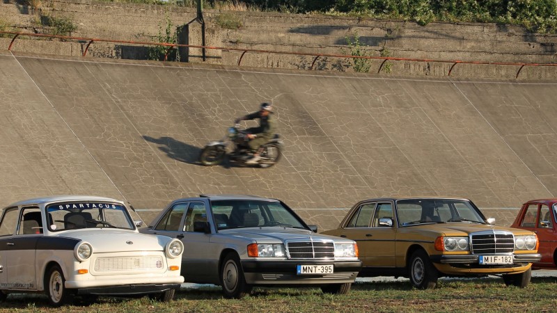 Északi-európai márkákból is szép sorok jöttek össze - oválosok, csillagosok, villámosok, bajor propelleresek mellett kilátogatott például egy púpos Volvo, azaz PV 544-es is, ami egész addig sehol nem okoz döbbenetet, míg ki nem derül róla, hogy egy ilyen, manapság már sokak által csak kedvesen esetlennek tűnő kocsi a hatvanas években a ralipályák sikeres típusa volt. 1965-ben például Safari Rally-t nyertek vele – értik, egy hóban fejlesztett skandináv technikával Afrikában. Ez körülbelül akkora meglepetés lehetett, mint nekem látni a sok szép öreg járművet, melyek tulajdonosaik jóvoltából remek hangulatot varázsoltak a betonkagylón belül.