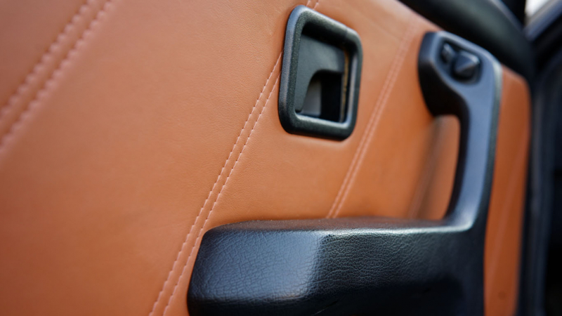 Apropó, bőrözés: egy korábbi tulajdonos megunta a fekete bőrüléseket a fekete kabrióban és úgy döntött, hogy átbőrözteti a teljes belsőt: így került barna (valódi) bőr a metálfekete karosszériával így csodásan harmonizáló beltérbe. A munkát kiváló szakemberek végezték, nagyon jó anyagból – ilyen ügyes munkával még a gyári megoldások között is rendkívül ritkán találkozhatunk.