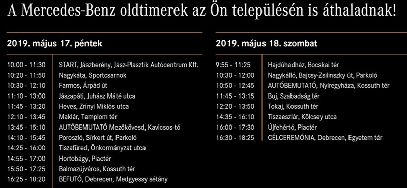 És hogy hol, illetve mikor lehet megtekinteni a XI. Mercedes-Benz Csillagtúra közel 100 tagot számláló mezőnyét? A bekezdés feletti képből kiderül; ha tudnak, látogassanak ki, mert biztosan nagy élmény lesz, mégpedig korosztálytól függetlenül. Mi pedig bízunk benne, hogy velünk lesz a szerencse...