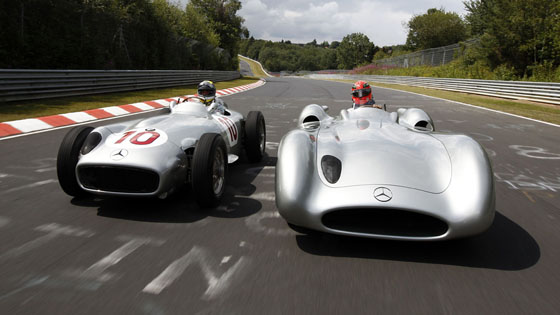 A történet 1954-ből indul; a Mercedes ebben az évben eresztette W196 kódjelű, sikert-sikerre halmozó versenygépét a pályákra. Tudják, ez a konstrukció volt az elődje a legendás 300SLR típusnak, érdekessége pedig többek között az volt, hogy a hosszú kompresszoros időszak után először használtak szívómotort a mérnökök, akik kiszámolták, hogy azonos teljesítmény mellett korábbi 1,5 literes kompresszoros erőforrásuk egy szívó egységnél akár 2,3-szor szomjasabb.