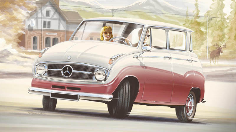 Talán a csillagos márka nézhet a legrosszabb szemmel a holland illusztrátor munkájára, de valljuk be, ezt bizony maguknak köszönhetik a németek. Az első generációs, 1997-ben bemutatkozott első és 2004-ben érkező második A-osztályt is sokan csúfolták szappantartónak, és valljuk meg, nem teljesen érdemtelenül. Mindezt ráadásul az is tetézi, hogy az 50-es években egy ilyen kisautót valószínűleg ugyanígy képzeltek volna el, magas üléspozícióval, amolyan aránytalan formákkal – ez pedig Ooms elképzelésén is visszaköszön, amelyen az íves és egyenes vonalak már kevésbé harmonikusak, mint mondjuk a Citroën C4 Cactus esetében.